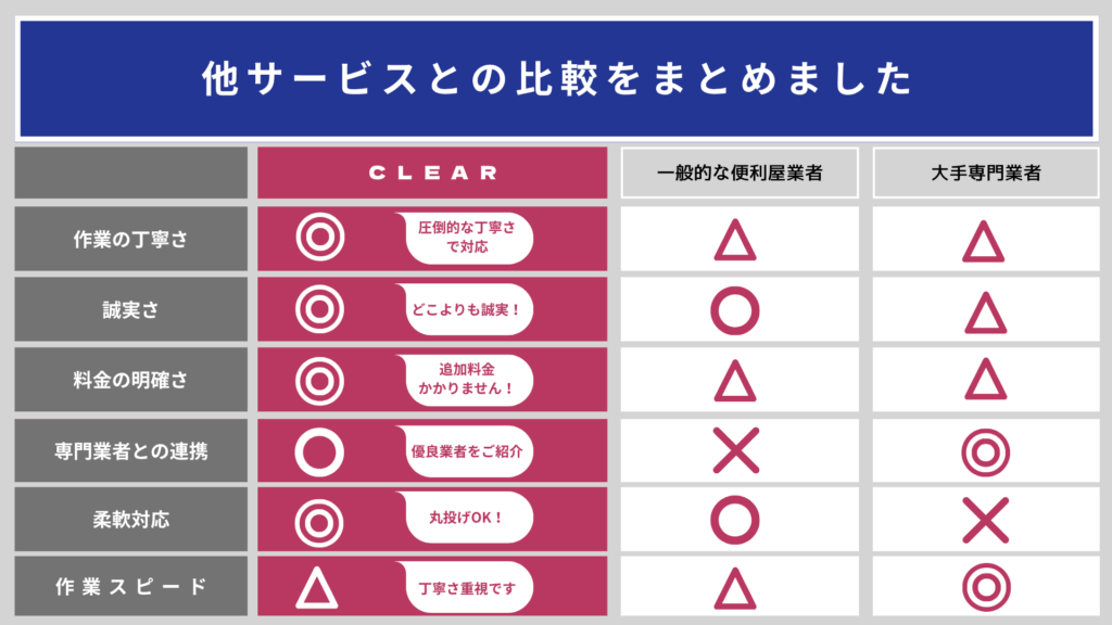 CLEARでは、みなさまにご納得して便利屋サービスをご依頼いただけるよう、実際にご利用いただいた声をもとに、常により良いサービスを追求しております。